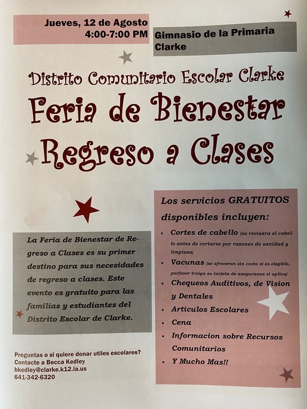 Our 3rd Annual Back to School Wellness Fair will be held on August 12 from 4:00-7:00pm at the Elementary School Gym and Cafeteria. This event is free and open to Clarke Community School District students of all ages. We will have many local resources and community partners present. Complete the "passport" by visiting booths and you'll be entered for a chance to win some awesome prizes! Below are some FREE services being offered: